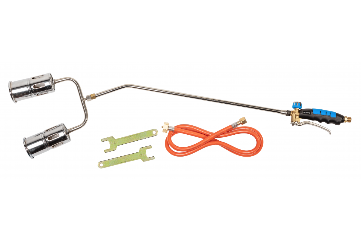 Профессиональный газовый паяльник. Набор включает в себя газовый паяльник с двумя соплами, газовый шланг 5 метров и монтажные ключи. Горелка оснащена точным регулятором мощности, благодаря чему можно регулировать температуру пайки в соответствии с типом и размером компонентов.
