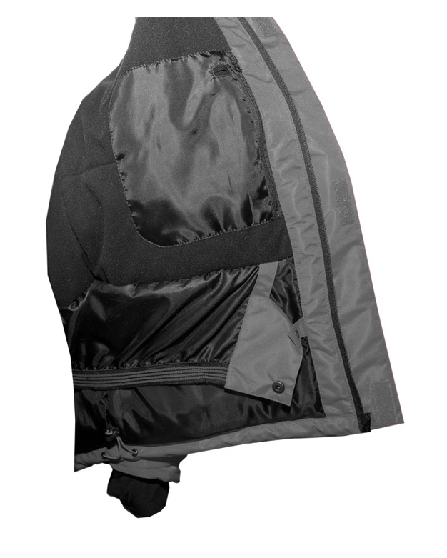 Шесть карманов: 2 – нагрудные внутренние на молниях с водоотталкивающим покрытием; 2 – нижние спереди с защитными клапанами на липучках и 2 дополнительные боковые; 2 – с внутренней стороны на подложке