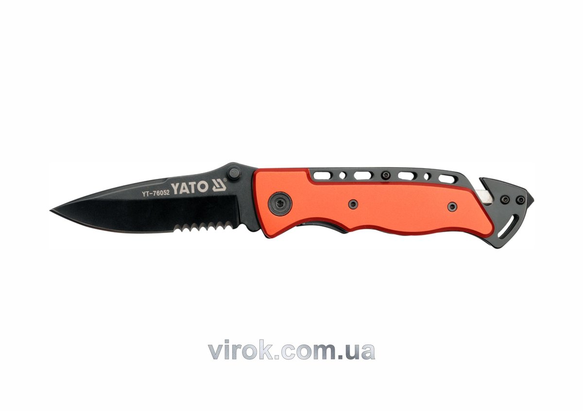 Складний ніж YATO з чорним лезом 'drop point', довжиною 80 мм, лезо з частин, зовні пряме, зсередини зубчасте, збільшує діапазон використання ножа, можливість відкриття однією рукою,