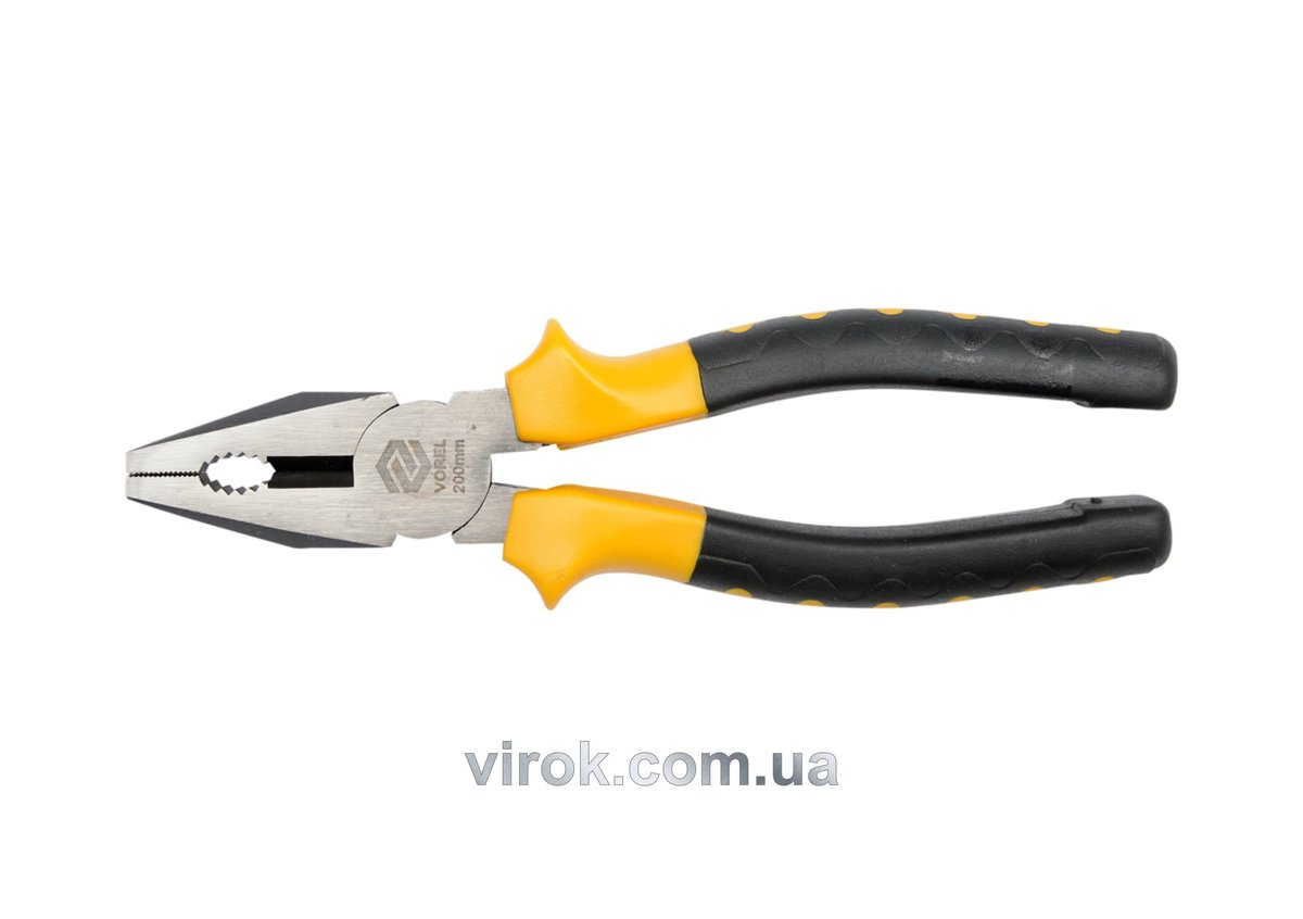 Плоскогубці універсальні 200 мм Vorel 40043. Поверхня губок зубчаста, що дозволяє надійно утримувати плоскі предмети та дрібні інструменти.