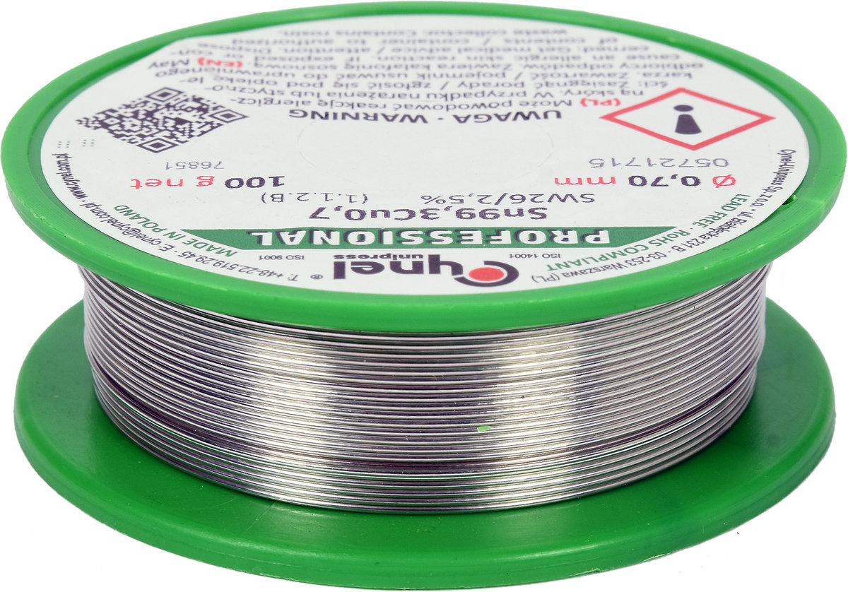 Припій без свинцю CYNEL : Ø0,7 мм, Sn99,3-Cu0,7 дротяний на котушці з флюсом m= 100 г [30]