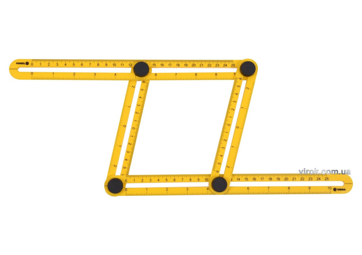 чотири плеча із зовнішніми розмірами - 310 x 175 x 25 мм, з'єднані стопорними гвинтами, дозволяють вільно підлаштовуватися під виміряні кути, легко фіксувати отриману форму і переносити розміри на матеріал, що розрізається