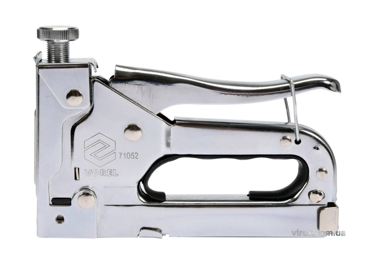 Степлер для оббивки Vorel 71052. Степлер для оббивки призначений для швидкого з’єднання різних матеріалів, наприклад дерева з тканиною, картоном, папером або шкірою. Використовується для оббивки, покрівлі, декорування, оздоблення будівель тощо. З’єднує матеріали за допомогою сталевої скоби, вбитої з великою силою. Степлер призначений для забивання типових сталевих прямокутних скоб довжиною від 4 до 14 мм. Степлер з регульованим тиском бойкової пружини - регульована сила удару.