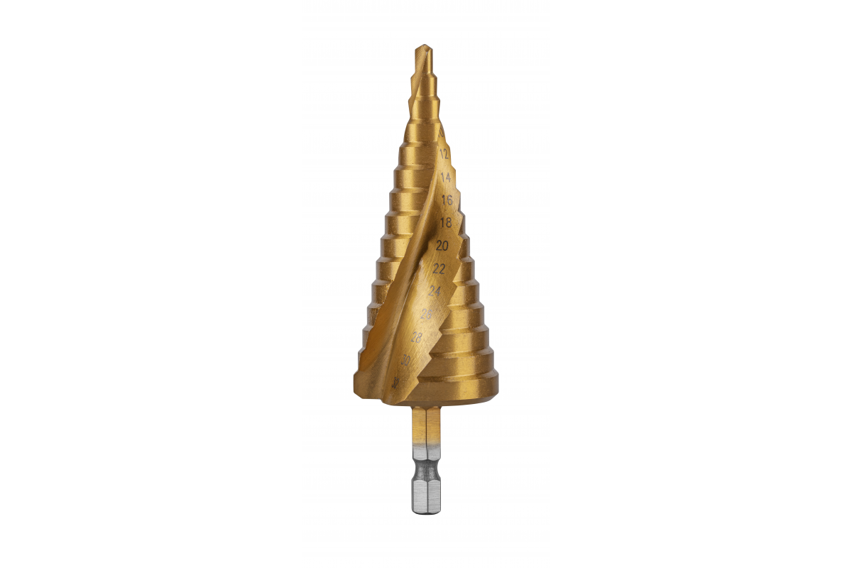 Ступенчатое спиральное сверло, предназначенное для сверления различных типов стали, цветных металлов, пластмасс и дерева. Позволяет сверлить точные отверстия. Сверло имеет спиральные режущие канавки, которые являются одной из наиболее эффективных технологий, используемых в ступенчатых сверлах, и позволяют гораздо быстро и эффективно сверлить отверстия, края которых остаются точно выровненными. Оно будет использоваться в мастерских по обработке листового металла, автомастерских или в работе установщиков и электриков. Для профессионального использования.