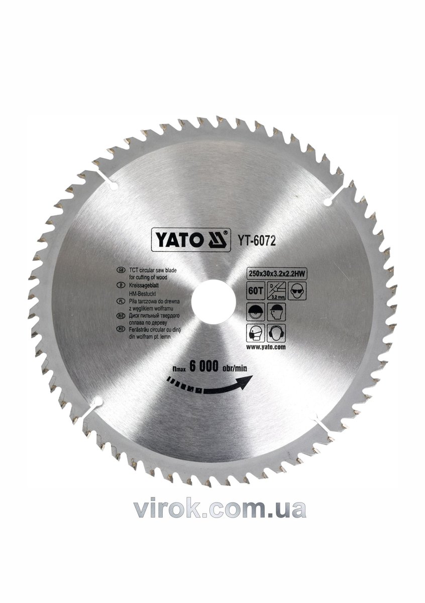 Диск пиляльний победітовий по дереву YATO: 250х30х3.2х2.2 мм, 60 зубців, R.P.M до 6000 1/хв [10/20]