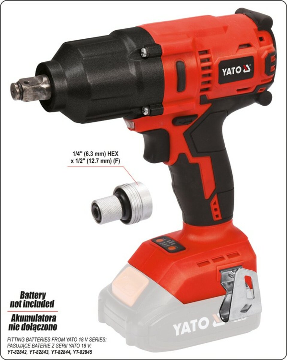 ключ повинен бути оснащений акумулятором від платформи YATO: доступні варіанти: 2Ah ( YT-82842 ), 3Ah ( YT-82843 ), 4Ah ( YT-82844 ) і 6Ah ( YT-82845 )