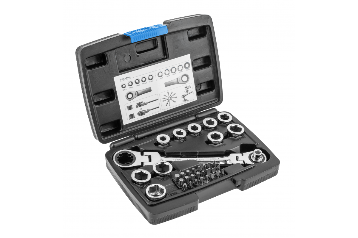 Ключ з тріскачкою, шарніром та набором спеціальних насадок, які ідеально підходять для відкручування та закручування різьбових з'єднань із шести або дванадцятигранними елементами кріплення. Завдяки тріскачці відсутня необхідність перекладання ключа, а насадки дозволяють працювати з болтами різних розмірів. 36 елементів набору дозволяють використовувати повний набір ключів розміром 8-19мм. Додатково набір містить 24 викруткові біти з адаптером. Універсальні можливості ключа дозволяють його використовувати як у майстернях, так і в ремонтно-будівельних та монтажних роботах.