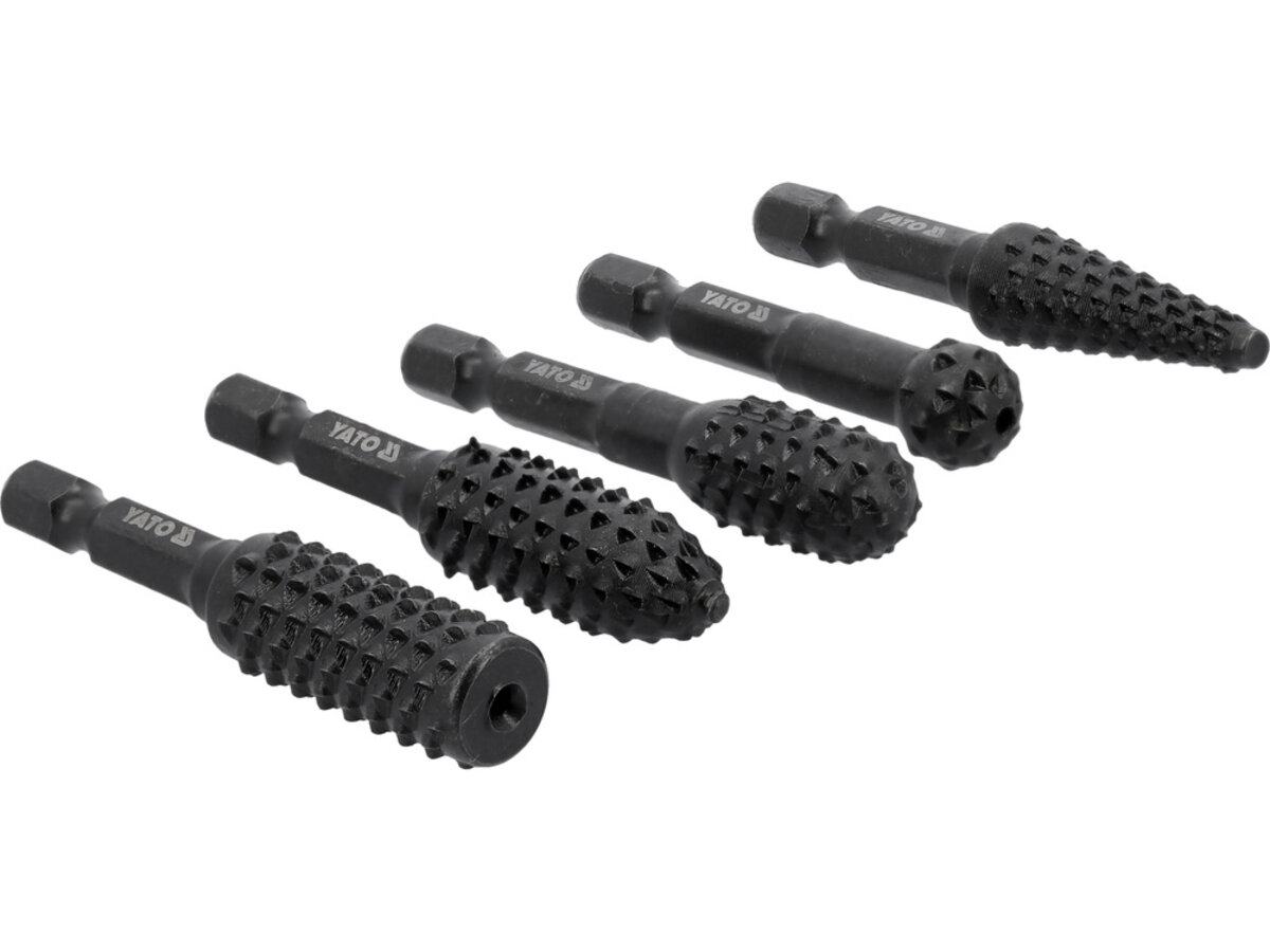 Опис товару ‐ Набір фрез рашпільних різної форми по дереву YATO з 6-гран. шпінделем 1/4", Ø= 12 мм, 5 шт. [50]