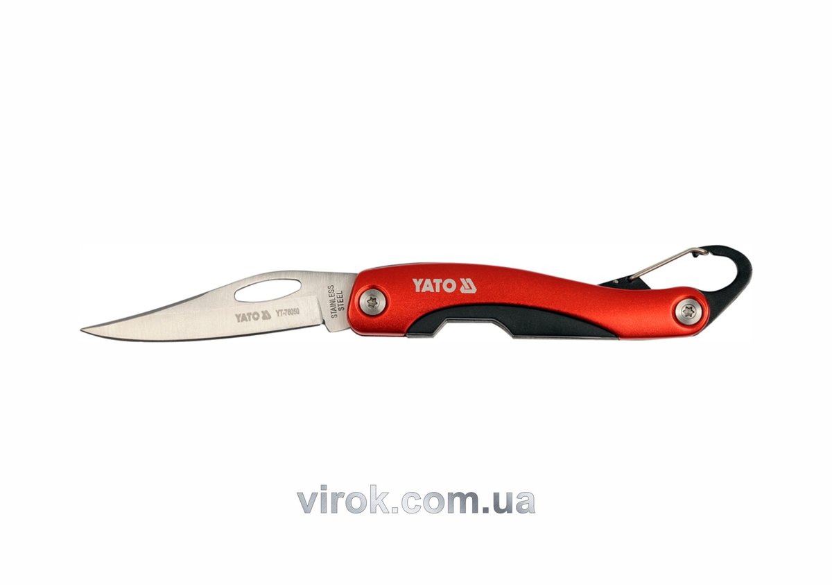 Легкий складаний ніж YATO з клинком "bowie" з нержавіючої сталі довжиною 75 мм, в корпусі з анодованого металу, що закінчується великим карабіном.