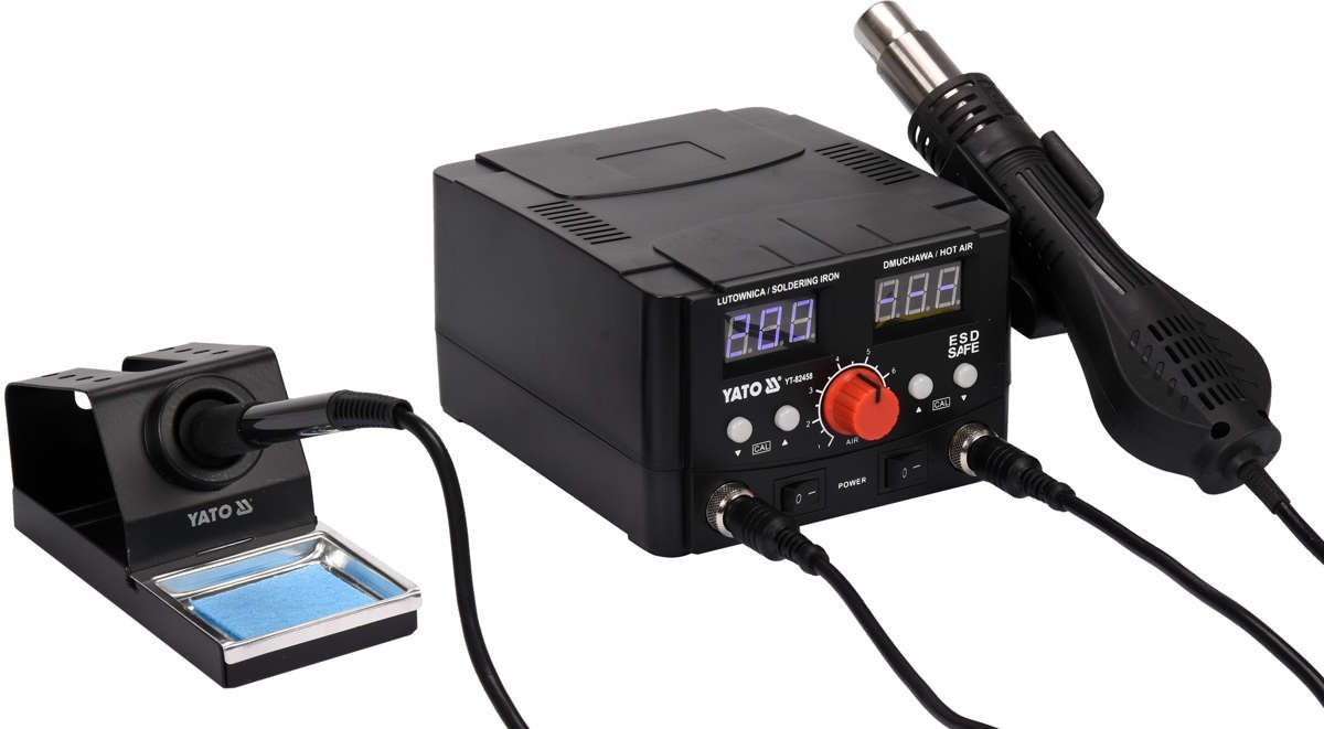 Опис товару ‐ Паяльна станція + фен мережеві YATO; Р= 75Вт, t°= 200-480°С, жало 900М, фен t°= 100-480°С 750В [6]