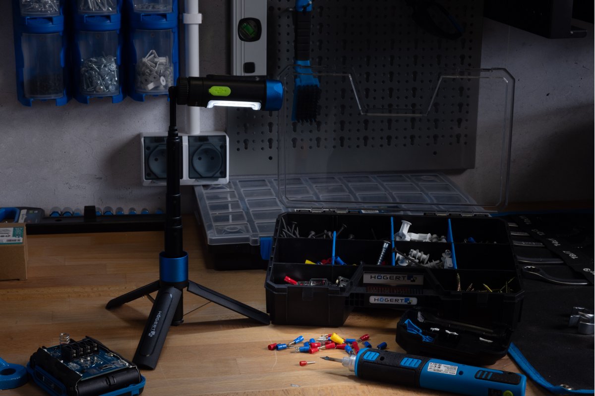 Прожектор, встановлений на штативі HT1E437, можна обертати у будь-якому напрямку, нахиляти під обраним кутом і встановлювати на комфортній для виконання завдання висоті.