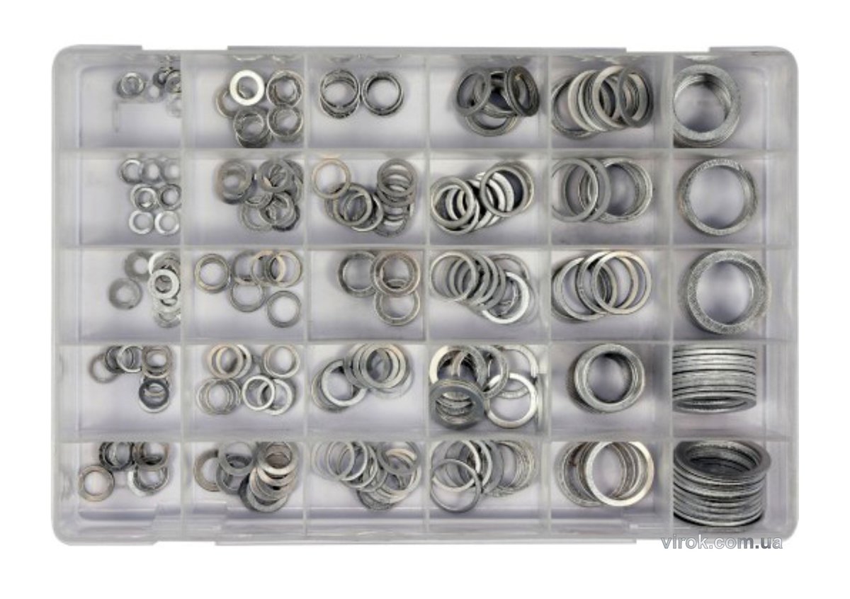Набір з 300 алюмінієвих шайб для зливних пробок. В наборі є шайби розміром від 5x9x1,0 мм до 28x36x2,0 мм. Весь набір розміщений у зручній сортувальній коробці.