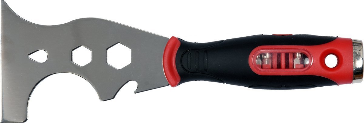 Скребок із профільованими очисними краями, з відкривачем кришки та лезом спереду. У центрі отвори для протягування цвяхів і два профілі для затягування шурупів.