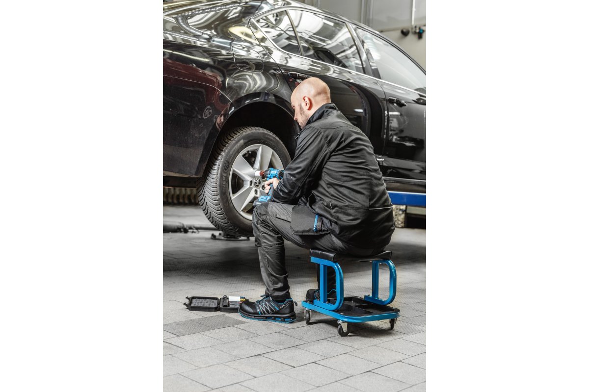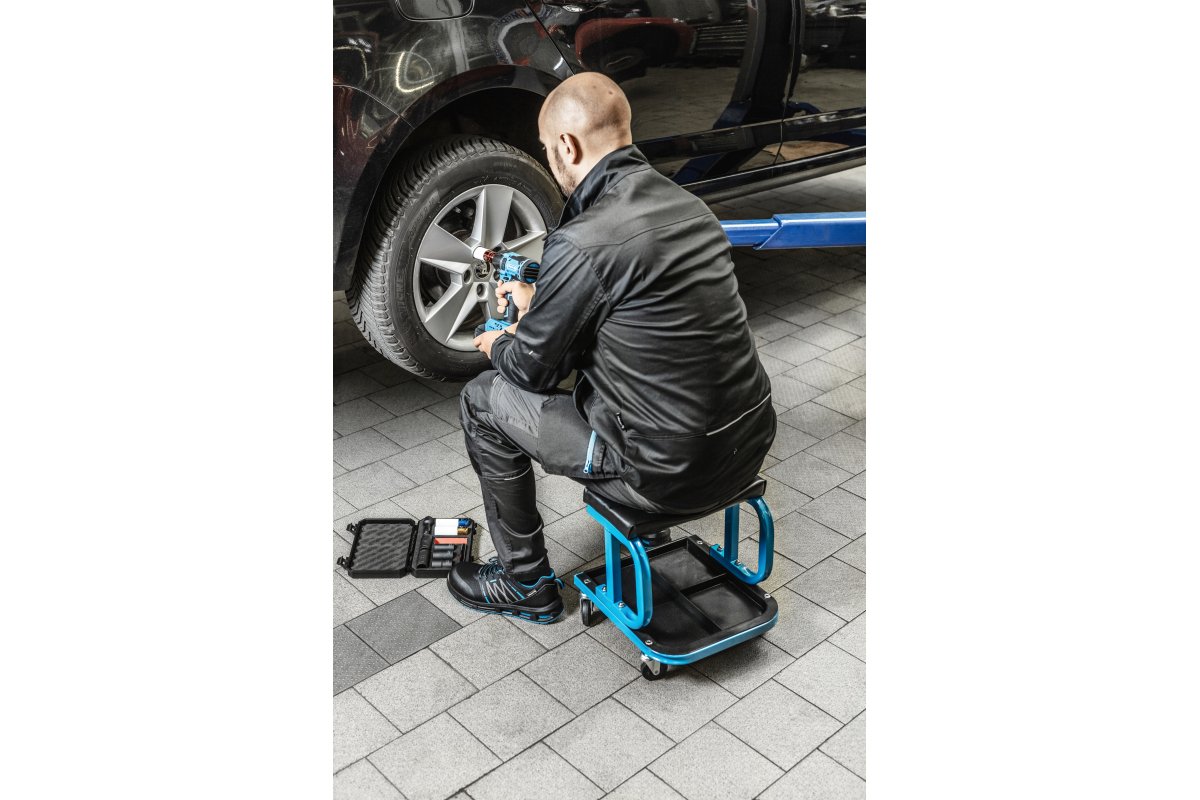 Сидіння для майстерні - це практичне рішення для людей, які працюють у майстернях, гаражах та інших місцях, де важливий комфорт під час роботи. Мобільні колеса дозволяють легко переміщатися по майстерні. Під сидінням є місце для зберігання, розділене на функціональні відсіки.