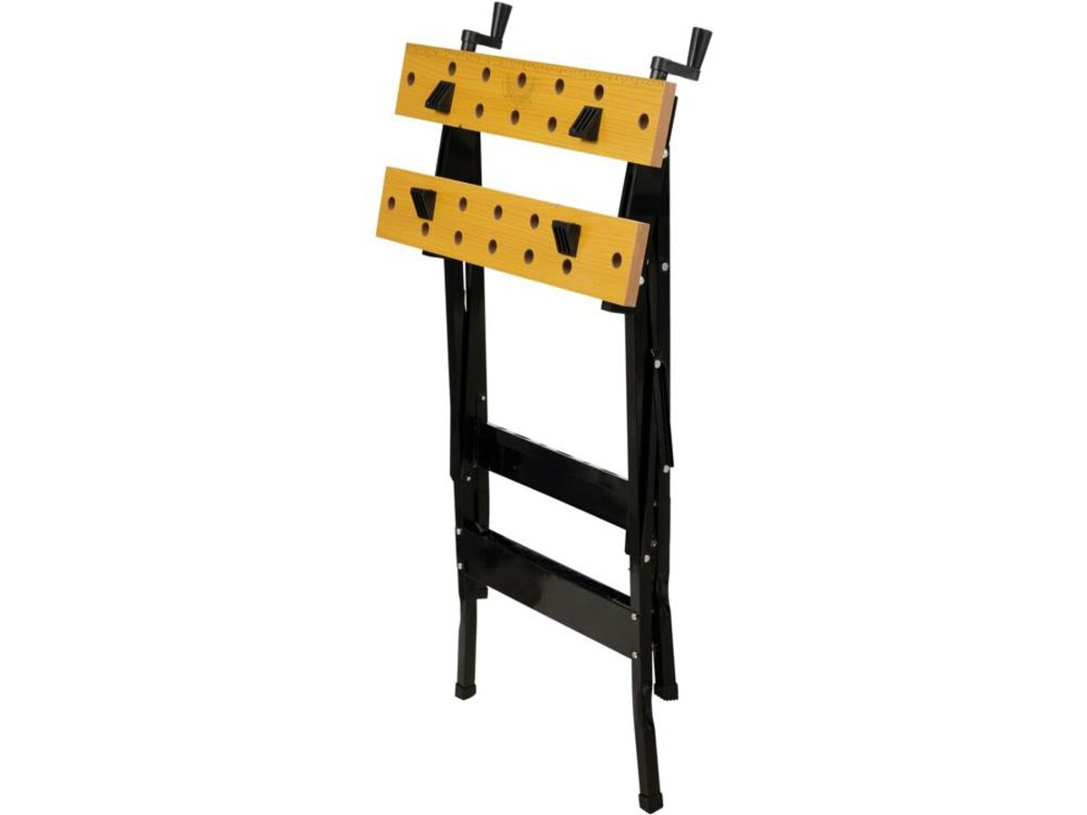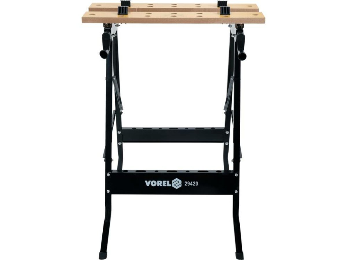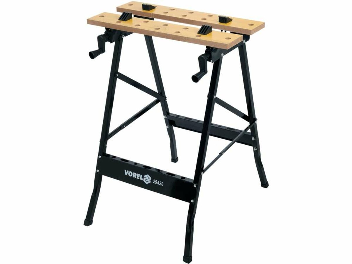 Розкладний робочий стіл зі стільницею з товстої МДФ плити. Робоча плита, що складається з двох частин розміром 560 x 100 x 18 мм, працює як лещата. Між ними можна затиснути заготовку. У пластинах є отвори для кріплення елементів кріплення матеріалу. Основа столу виготовлена з металевих профілів перерізом 20 х 20 мм. Металеві частини захищені від корозії, пофарбовані порошковою фарбою. Ніжки оздоблені протиковзкими ніжками з ПВХ, що гасять вібрацію. Допустиме навантаження столу 70 кг Стіл призначений для майстерень і монтажних робіт, особливо вимагають роботи поза приміщенням майстерні. Легко транспортувати і монтувати Конструкція стільниці забезпечує стабільне кріплення матеріалу, замінюючи лещата і столярні затискачі.