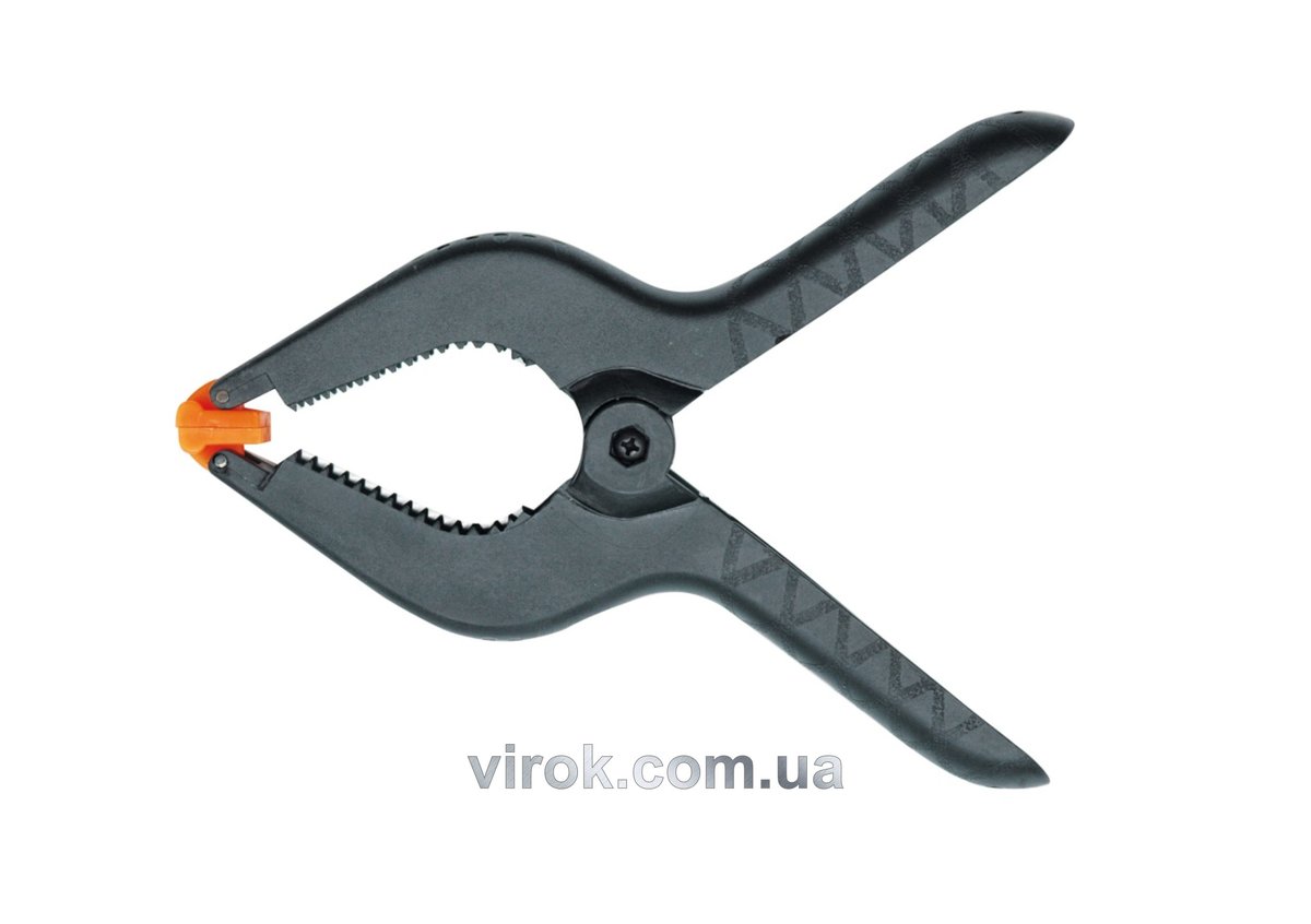 Пружинна струбцина 100 мм. Виготовлена з міцного пластику з міцною сталевою пружиною. Маятникові губки забезпечують точне пристосування до матеріалу. Для швидкого затискання матеріалів, наприклад, при склеюванні.