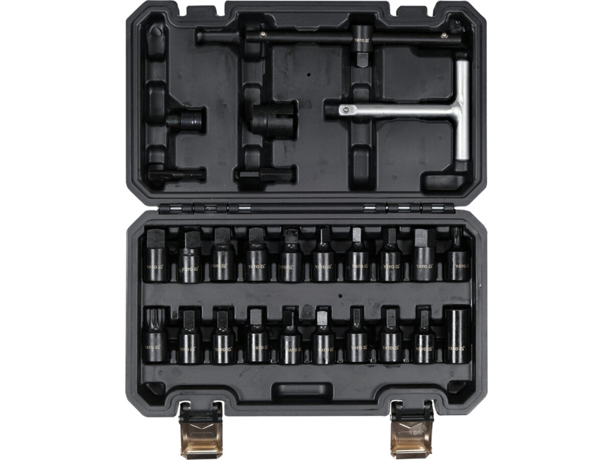 Опис товару ‐ Торцеві насадки з устаткуванням для оливозливних пробок YATO: квадрат- 3/8", Cr-V, 26 шт в футлярі