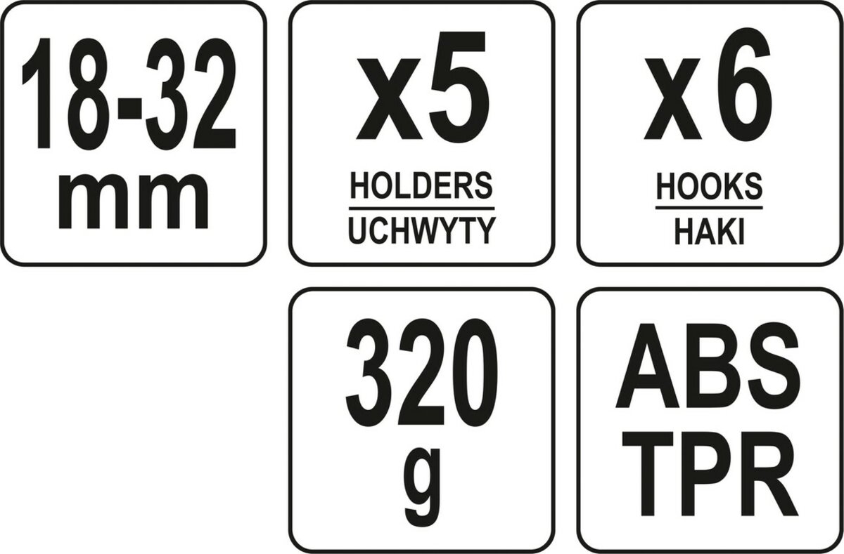 Вішалка для присадибного інвентара YATO, 6 гаків і 5 комірок з діапаз.- 18х 32 мм [40]