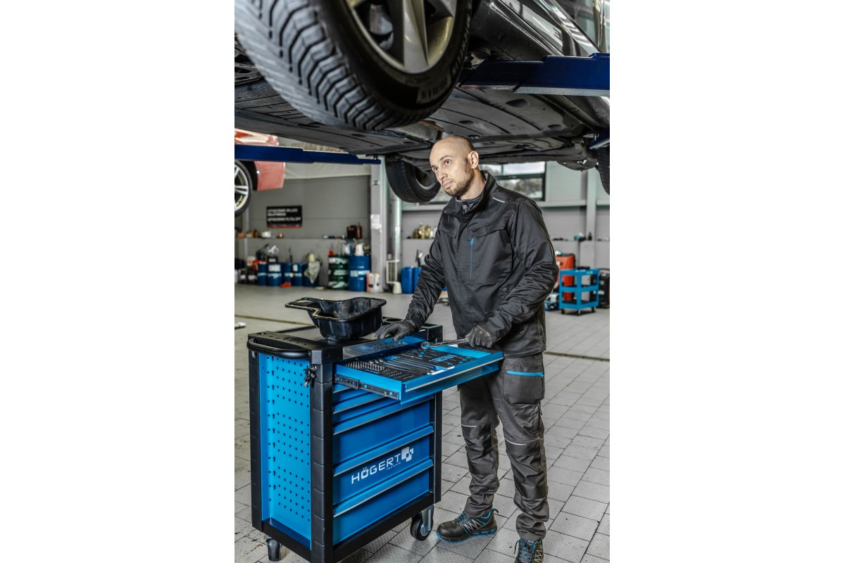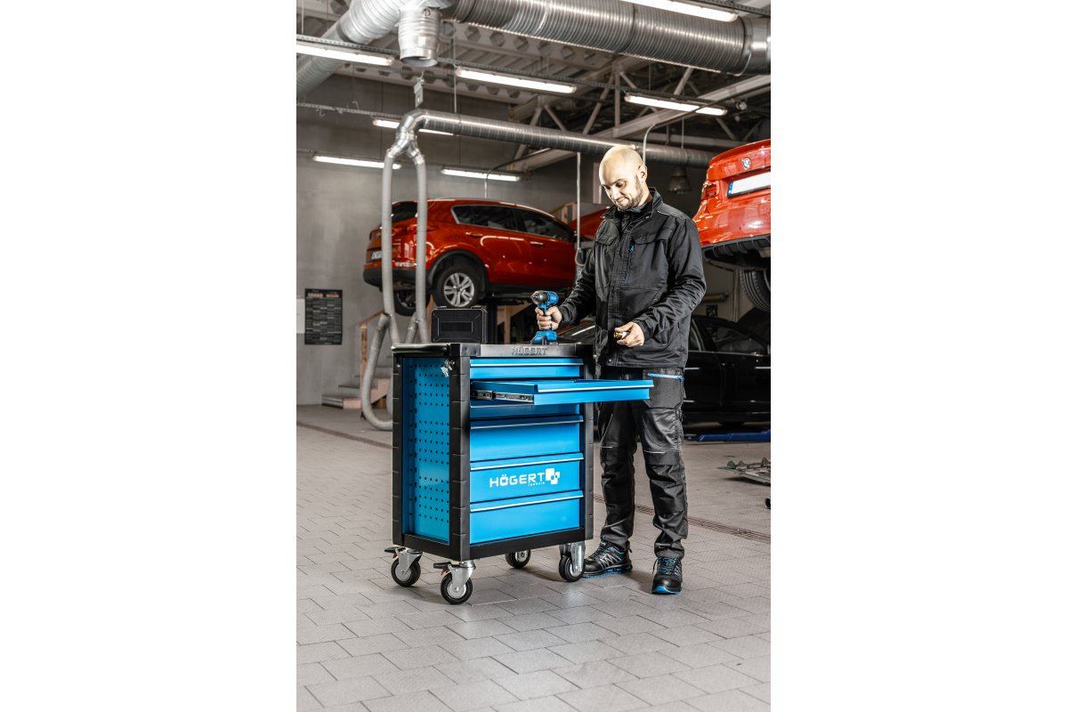 Практична шафа для інструментів із 6 ящиками для зберігання інструментів і аксесуарів. Він знадобиться в автомайстерні або в гаражі кожного ентузіаста DIY. Шафа має сучасний вигляд, який ідеально вписується в інтер'єр різних майстерень або гаражів. Це також підкреслює професійний характер робочого місця. Він виготовлений з міцних матеріалів, що гарантує його довгий термін служби та стійкість до пошкоджень. Стійка конструкція забезпечує надійне зберігання цінних інструментів. Шафа оснащена 2 фіксованими і 2 поворотними колесами з міцного матеріалу TPR. Це дозволяє легко переміщати шафу по майстерні або гаражу навіть з великим вантажем.