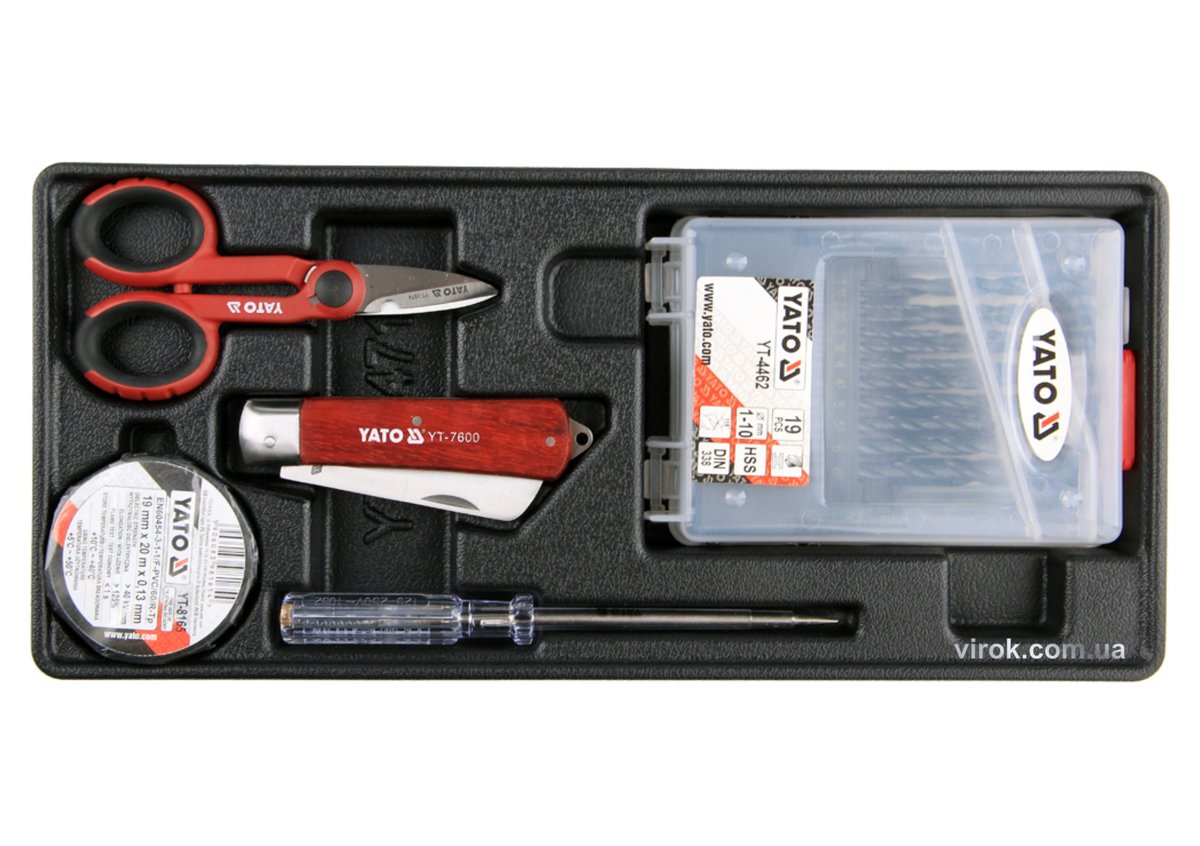 Вклад до інструментальної шафи YATO з 19 свердлами Ø=1-10 мм, ножиці, ніж, викрутка-індикатор 250 В