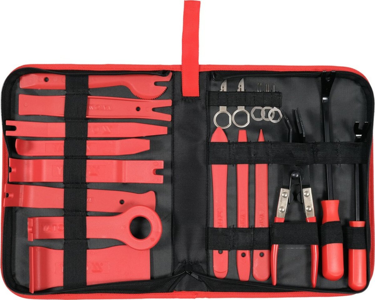 Професійний набір знімачів для зняття автомобільної оббивки, кліпс та обшивки. Також стане в нагоді для зняття автомагнітол, лічильників, електронного обладнання. Елементи виготовлені з міцного пластику, тому ви не подряпаєте краї оббивки при підкопуванні. Набір рекомендований для роботи в автосервісах, оббивних, кузовних і фарбувальних майстернях.