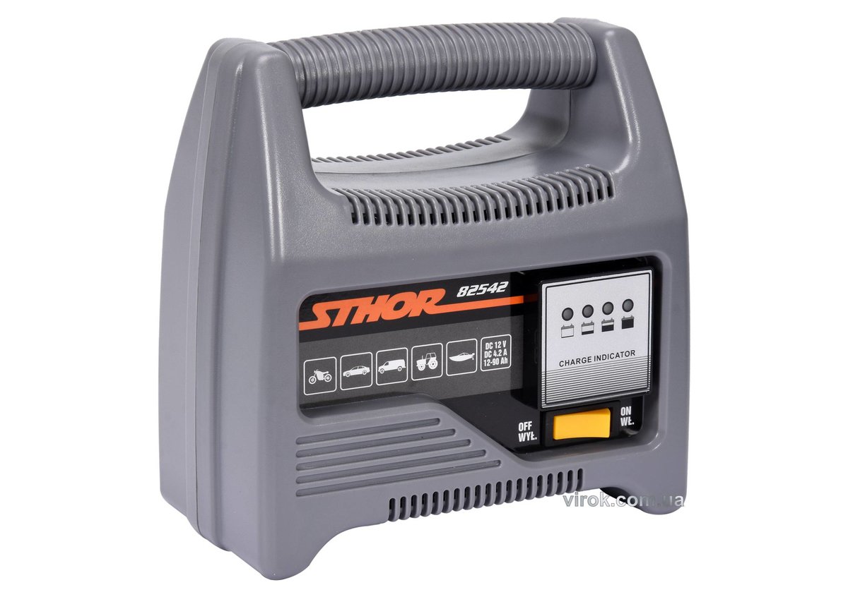 Зарядний пристрій марки STHOR має тороїдальний трансформатор, запобіжник від перезарядження і перенапруги, перемикач струму, світлодіодний індикатор зарядки. Дозволяє вибрати оптимальний зарядний струм. Пристрій призначений для зарядки 12-вольтових акумуляторів легкових автомобілів, для WET (мокрих, свинцево-кислотних) акумуляторів.